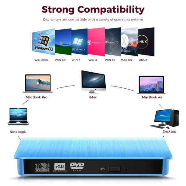 This external optical drive supports a broad spectrum of media formats, including CD, VCD, SVCD, DVD, DVD-R, DVD-RW, CD-R, CD-RW, and more. It features advanced error correction, anti-shock technology, and noise reduction for a smooth, reliable experience whether you’re listening to music, watching movies, or burning discs.